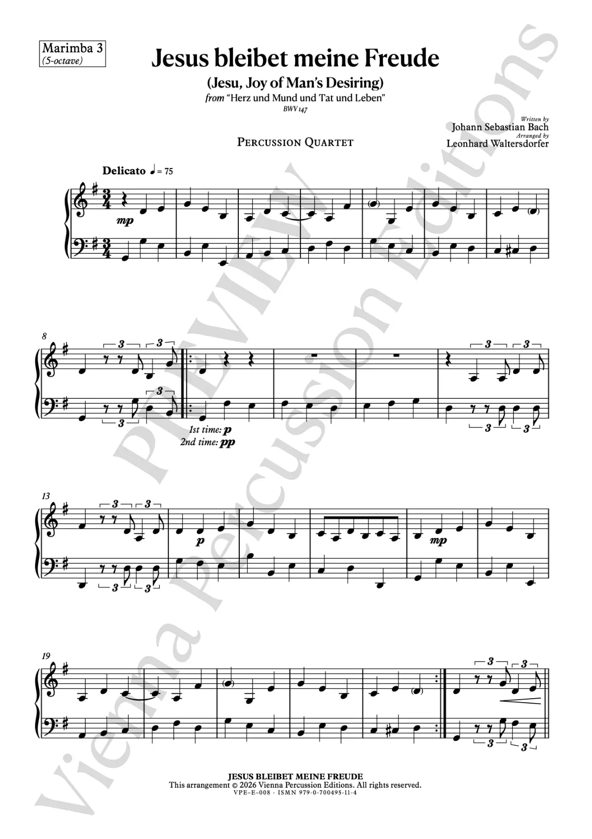 Jesus bleibet meine Freude is an arrangement of Johann Sebastian Bach’s well-known chorale for percussion quartet, scored for vibraphone and three marimbas.