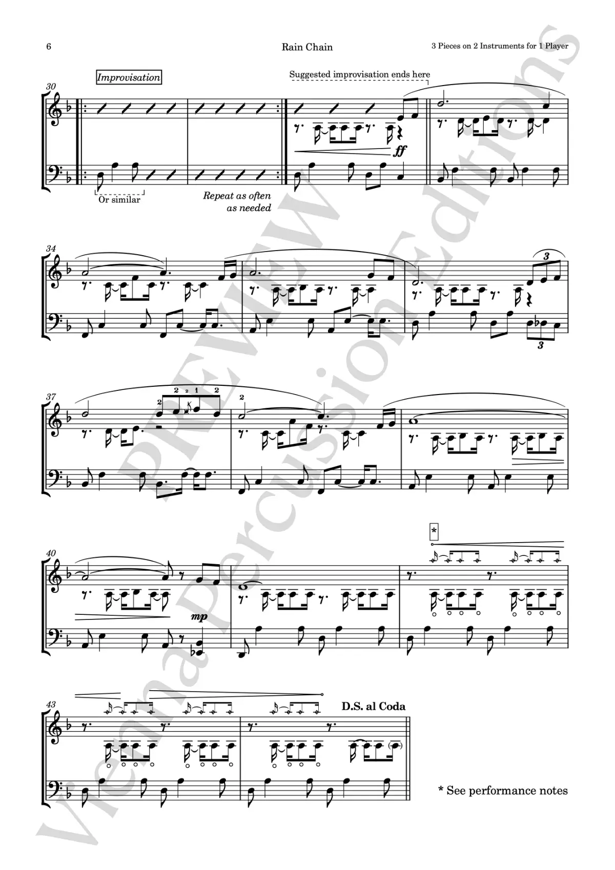 The notation reflects this balance: precise where necessary, open where musical flexibility is essential. The collection is intended both as a concert work and as an exploration of extended performance practice, offering a distinctive approach to solo mallet playing that is idiomatic, challenging, and musically direct.